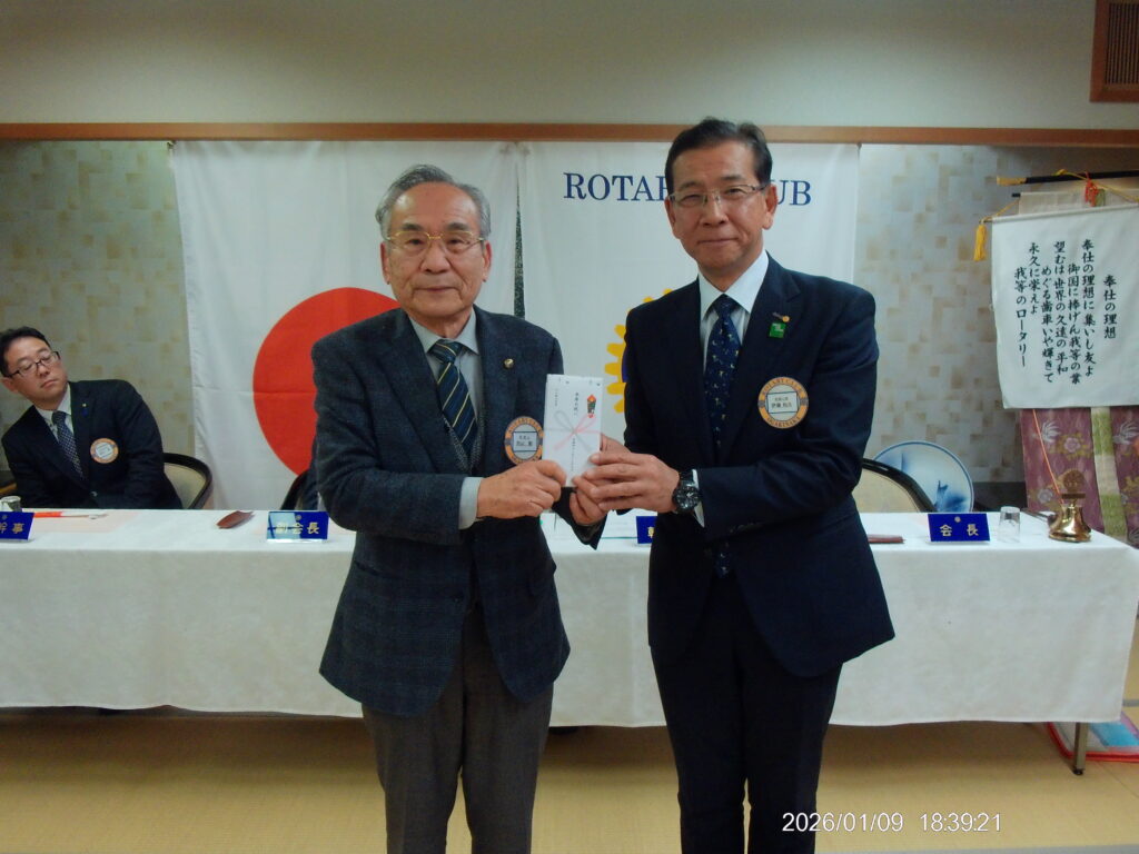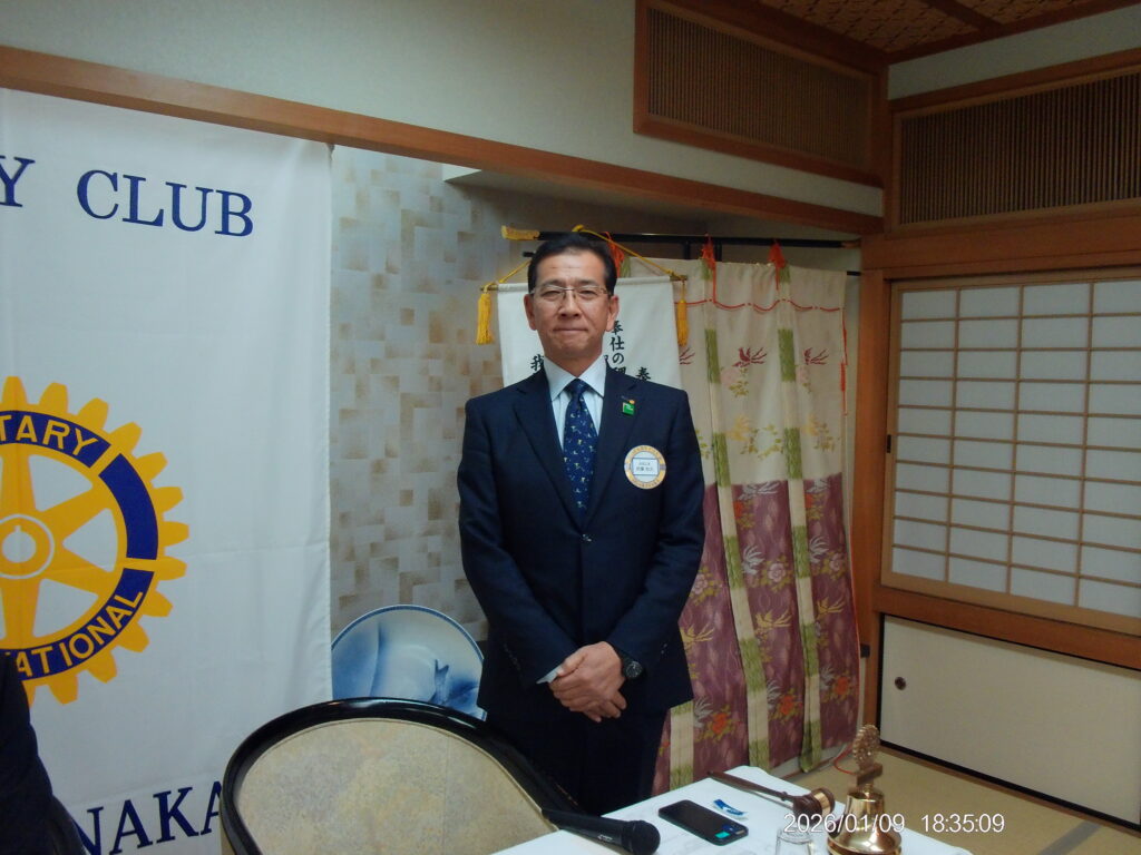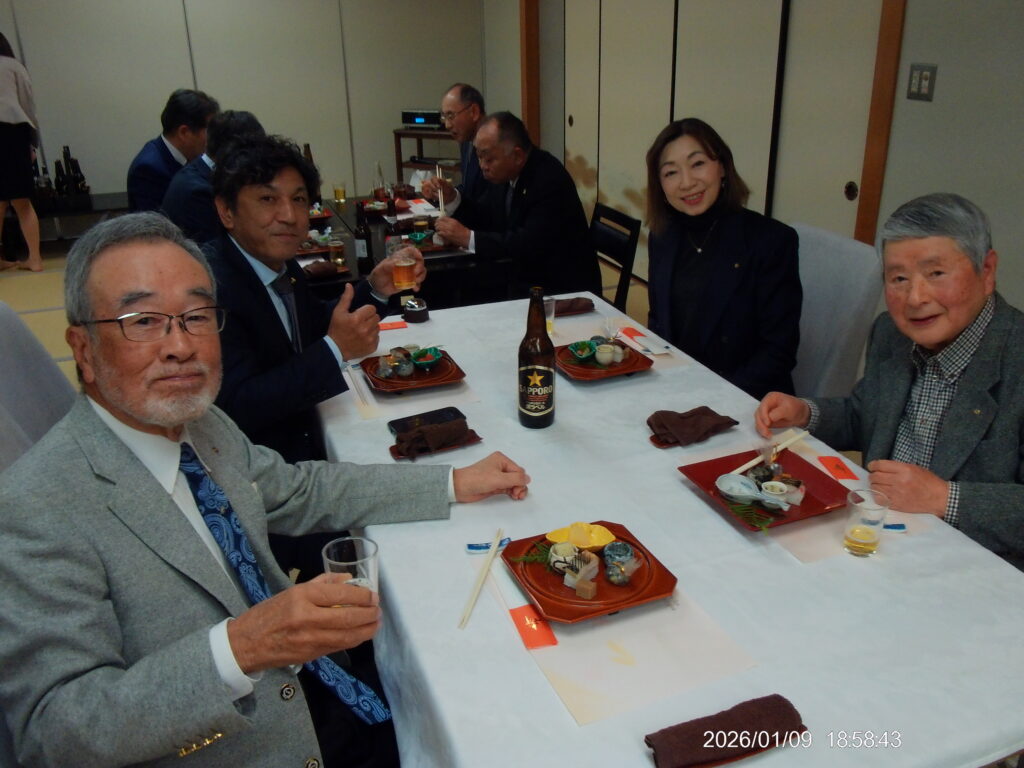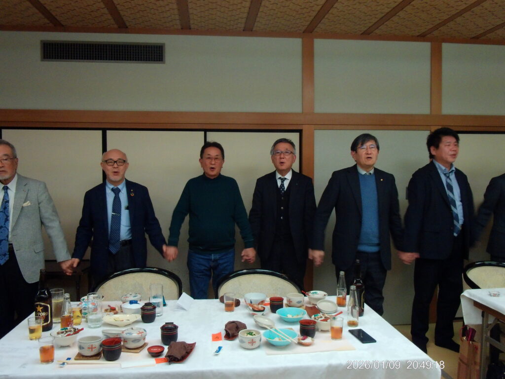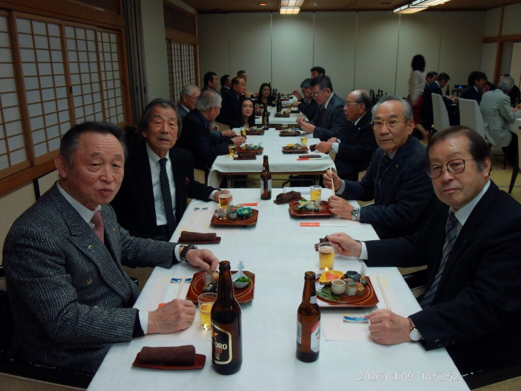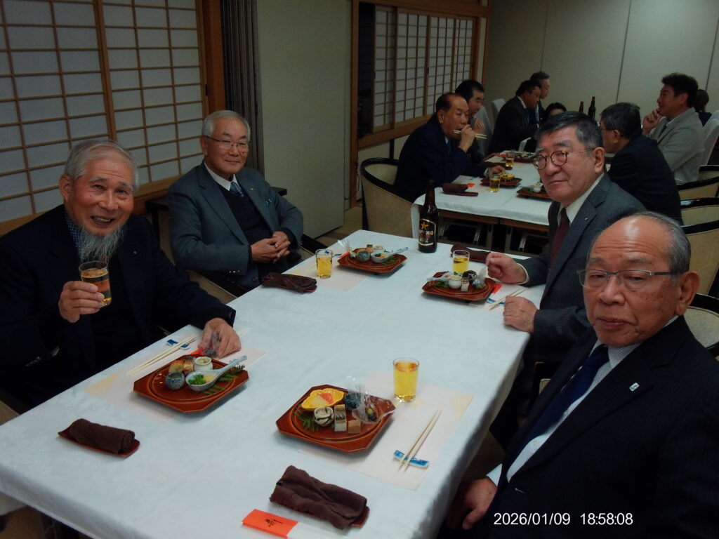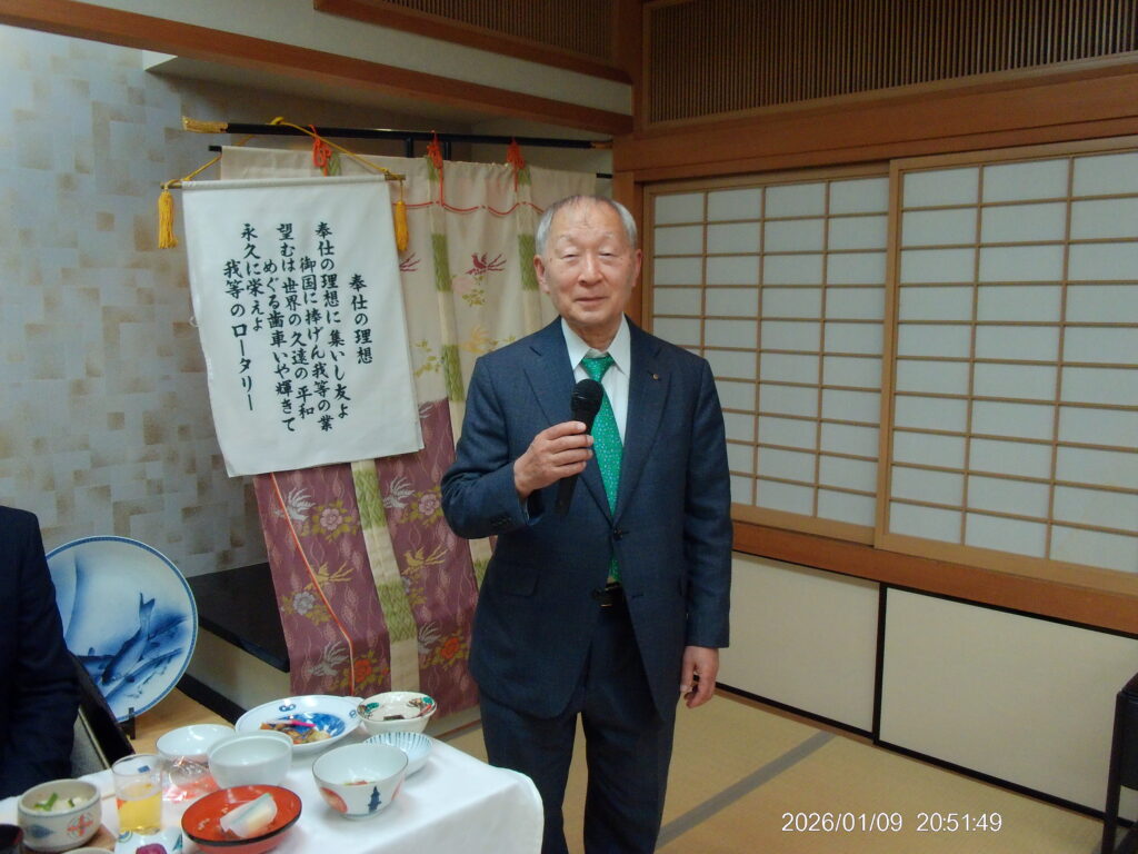 1月9日 例会 2026年1月15日 最終更新日時 : 2026年1月15日 大垣中ロータリークラブ 今年度第19回 通算1854回 場所 玉子屋別館玉辰摟 内容 新年初例会 新年互例会 伊藤和久会長 向山勲会員 米寿お祝い 間瀬隆弘 様 中村一 副会長